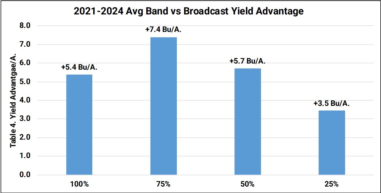 - Producers have reported higher yields with banded nutrients compared with broadcast fertilizer. Source – Strip-Till Farmer. The independent, multi-year yield study below from Precision Planting’s PTI Results show yield comparisons between banded vs. broadcast fertilizer in corn from 2018-2024, resulting in positive yield benefits for banding. The study also shows comparisons when reduced rates are used, consistently showing yield benefits to banding fertilizer.