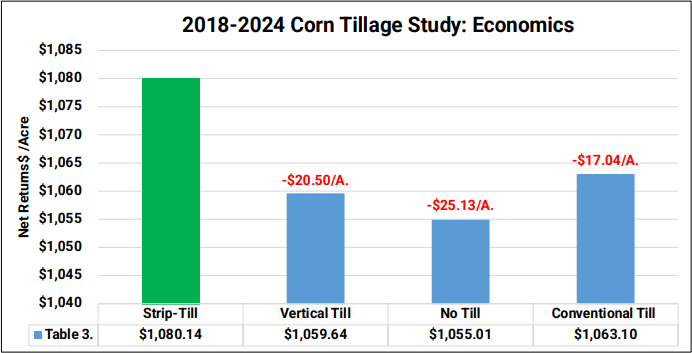 - Economic analyses from Precision Planting’s PTI Studies show the positive returns per acre on strip-till vs. other tillage methods on independent studies from 2018-2024 averaging $17- $25 per acre.